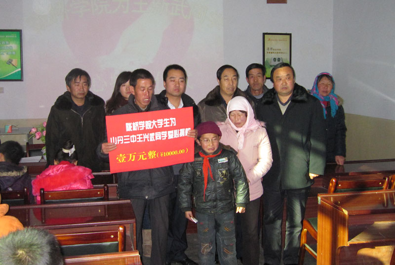 2010年的最后一天,天气依然寒冷,但在张掖山丹三中的校园里,充满着爱心的暖流。12月31日上午,我系党总支康昱明书记和2010年暑期“三下乡”社会实践志愿者代表黄静怡将我系和工商管理系大学生为王兴武同学的爱心捐款壹万元(10000.00)和同学们的良好祝愿送到三中、送到王兴武同学的家长手中。