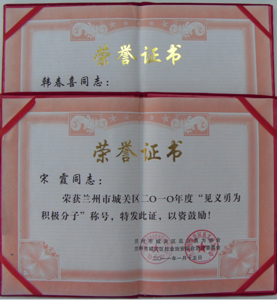 近日,兰州市城关区社会治安综合治理委员会发文(城综治委发[2010]24号)确认了包括我院艺术设计系韩春喜、宋霞在内的8名同志为见义勇为积极分子的决定。