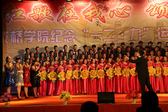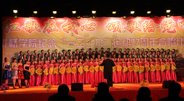 为纪念“一二﹒九”爱国运动77周年,弘扬和传承“一二﹒九”运动精神,增强同学们的社会责任感和历史使命感,由学院团委主办,各系团总支承办的 “红歌在我心,颂歌给党听”-纪念“12.9”运动77周年合唱比赛,于2012年12月9日20:00在体育馆顺利举行。