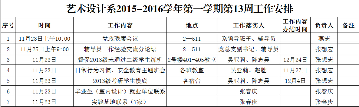 艺术设计系2015-2016学年第一学期第13周工作安排
