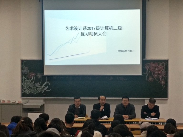 为提升我系学生计算机二级水平,全面推进应用型人才队伍建设,我系于11月4日晚在2号楼415教室召开了2017级计算机二级复习动员大会,艺术设计系主任张春庆副教授、党总支书记马进宝、教学副主任闫奇峰、2017级辅导员老师陈志昊及2017级未通过二级的学生参加了大会。大会由陈志昊老师主持。
