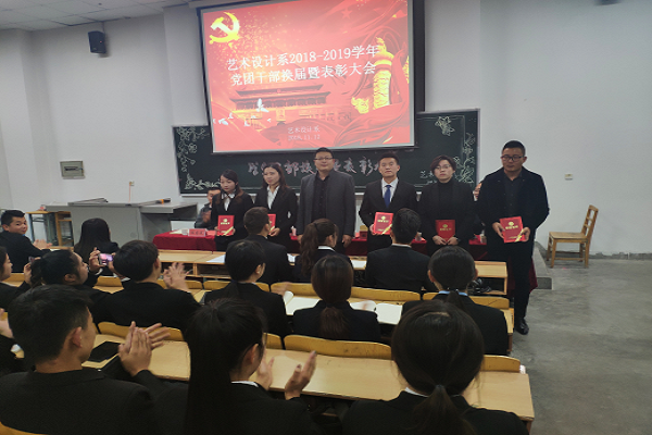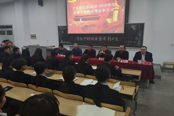11月12日下午艺术设计系在2-415教室召开了2018-2019学年党团学生干部换届暨表彰大会。参加大会的有系主任张春庆副教授、党总支书记马进宝、教学副主任闫奇峰副教授、全体辅导员老师及全体党团学干部,大会由系团总支书记花彤主持。