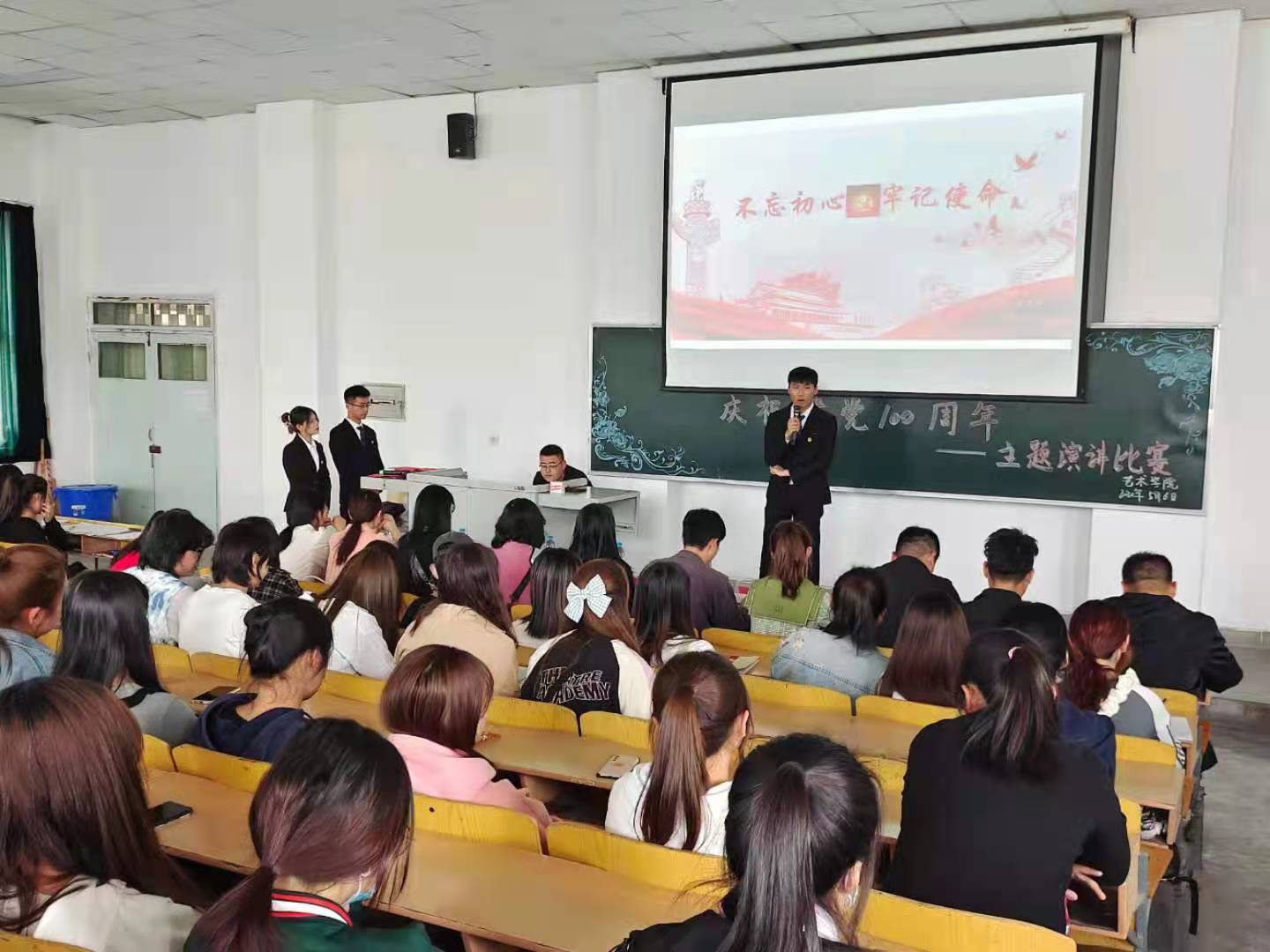 为庆祝中国共产党建党100周年,重温党的光辉历程,充分展现出当代大学生真挚的爱党爱国情怀。5月6日,艺术学院在2-415举办“青春心向党”纪念建党100周年主题演讲比赛。学院党总支书记刘灿帅、团总支书记花彤、辅导员老师赵胐担任评委及颁奖嘉宾,各年级参赛代表及观众参加了此次比赛。