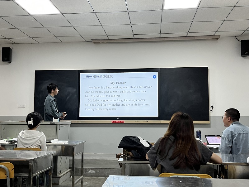 活动伊始,辅导员老师赵胐谈到口语的重要性,学习口语不仅能够在语境中提升语感,而且提高学生“读与写”的能力,强化英语学习技巧,提高英语综合水平;其次,活动进入到英语小短文的诵读环节,本期的主题是“My Father”,由老师打开事先准备好的小短文,邀请同学们上台进行演讲;接着,所有同学积极讨论,交流自己在学习过程中的心得体会;最后,赵胐做了简单的总结,希望大家积极参加学校组织的各项学习活动,建议同学们利用各种碎片化时间多练习口语、多听原声录音、听国外政客的演讲录音,学习他们的语调、节奏等,或者多看国外生活情景剧之类的影片、锻炼英语表达能力。只有掌握这些方法,勤加练习,大胆去读,才能更快地掌握口语技巧。