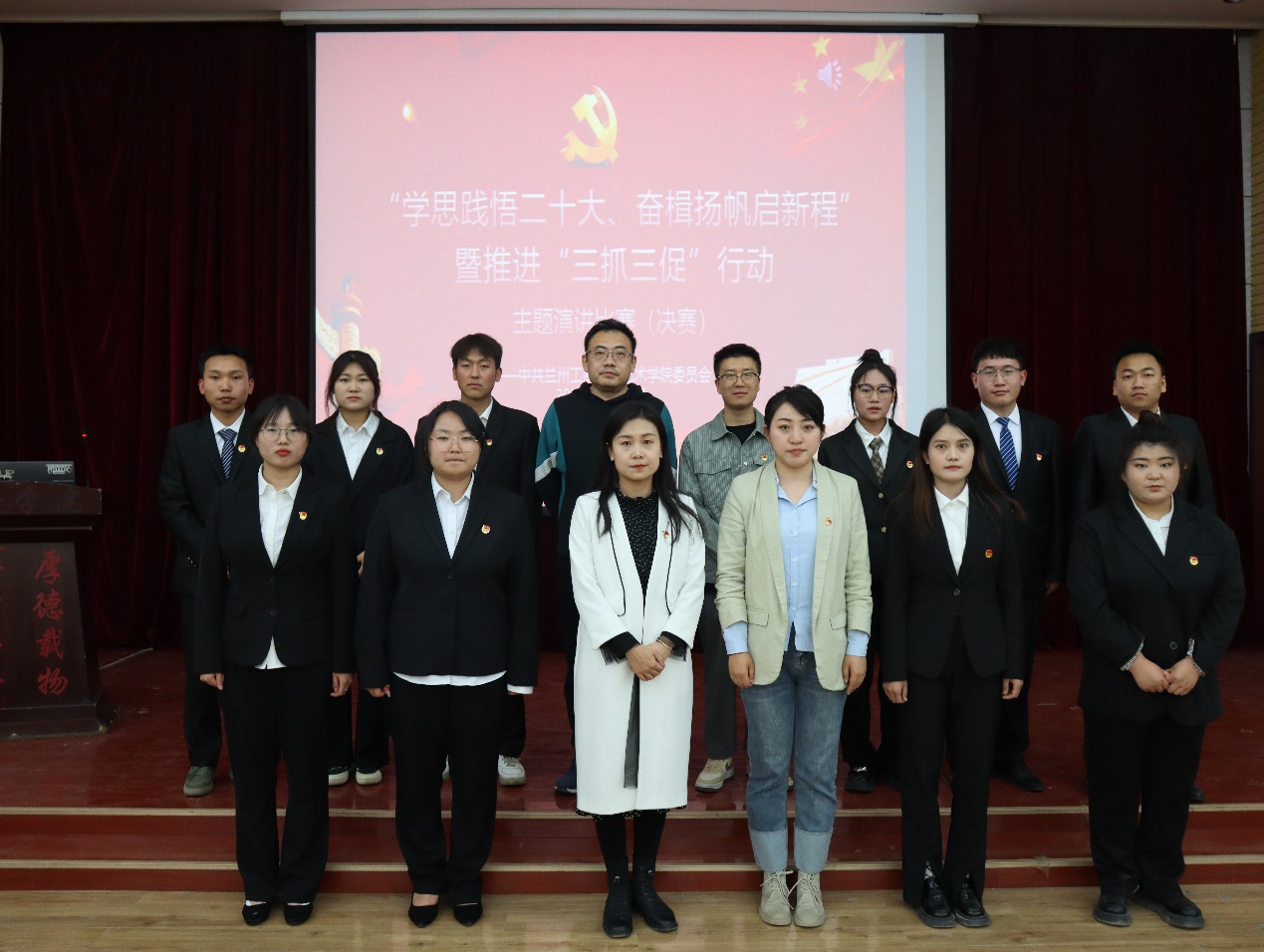 为深入学习贯彻习近平新时代中国特色社会主义思想和党的二十大精神,进一步巩固党史学习教育成果,坚定理想信念,做新时代的学生先锋模范。我院在全体党员、积极分子范围内组织开展“学思践悟二十大、奋楫扬帆启新程”暨推进“三抓三促”行动主题演讲比赛,并于4月20日下午进行决赛,决赛现场邀请学院党委书记周欣出席,并与各学生党支部书记、党员学生代表组成评委,全体党员、积极分子代表参加。