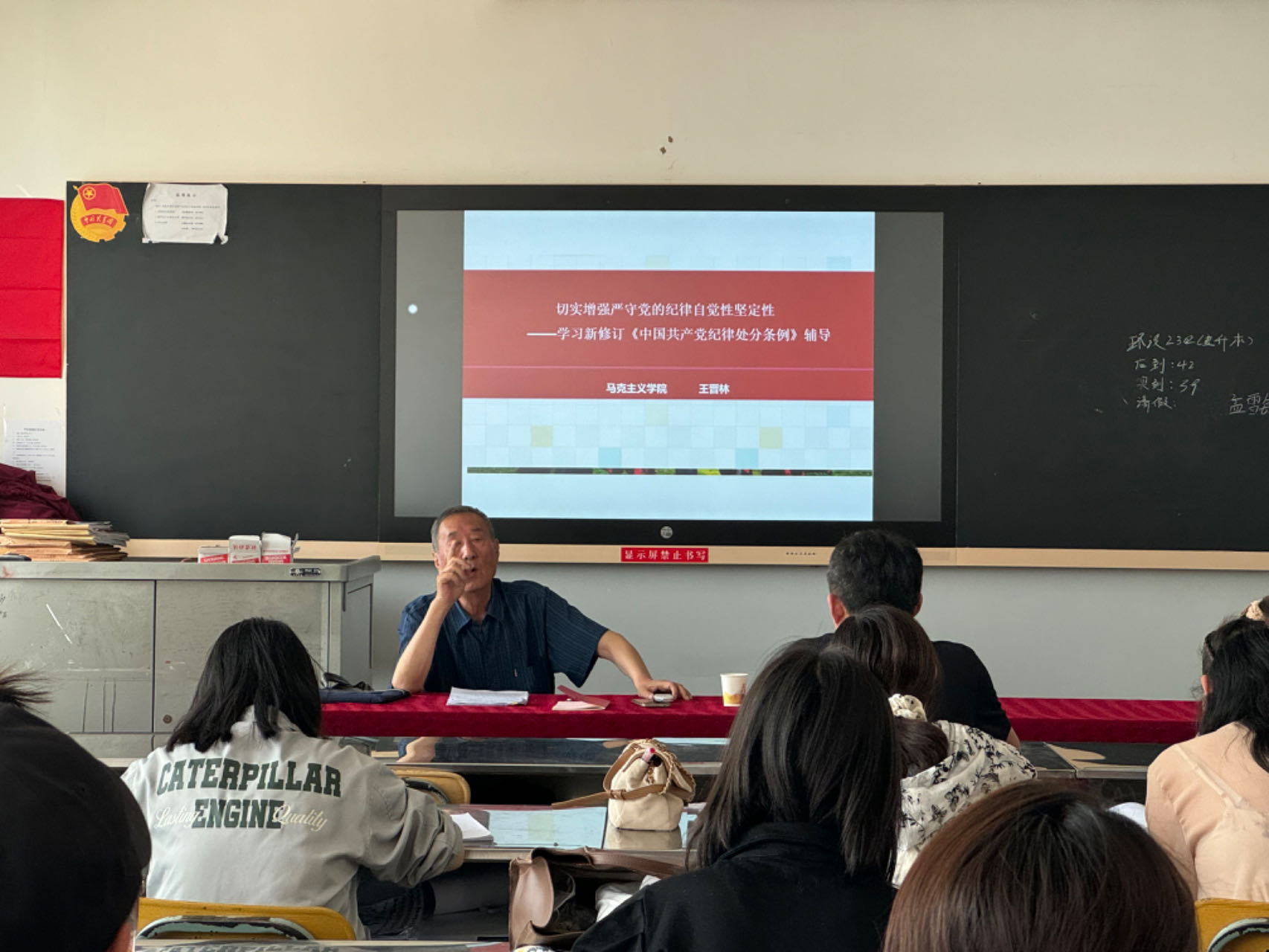 为进一步加强党风廉政建设,始终保持党的积极性和纯洁性,积极发挥基层党组织在高校教育教学中的领导作用,根据学校党委安排,5月30日下午,我院组织全体教师开展了党纪教育专题学习会,本次学习特邀马克思主义学院院长王晋林教授作专题学习指导,学院全体教师参加。