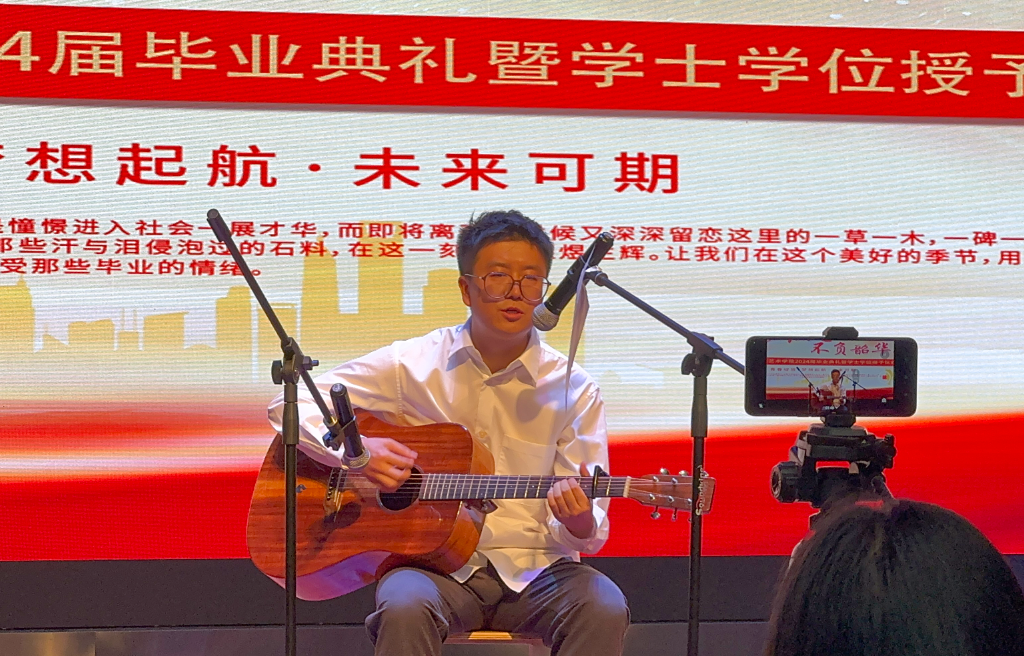 最后,艺术学院办公室主任兼毕业班班主任任文刚老师为2024届全体毕业生献歌一首《平凡之路》,希望全体毕业学长们在平凡的道路上创造不平凡的自己。