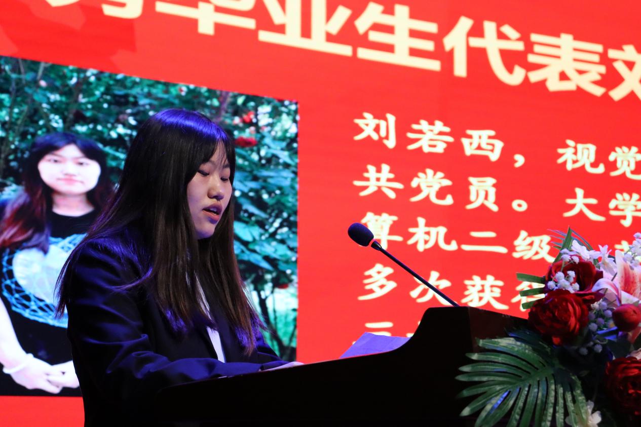优秀本科毕业生代表刘若西发言,她回顾了在学院的青葱岁月,共同表达对学弟学妹的祝福以及对母校的感恩。接着,教师代表王立娟老师讲到,要用自己的作品传递正能量,引领社会风尚,注重品德修养,德才兼备。以自己的智慧和汗水搭建属于自己的人生舞台,抒写华丽的人生篇章,学院永远以你们为傲。