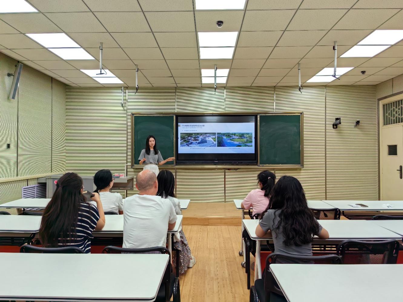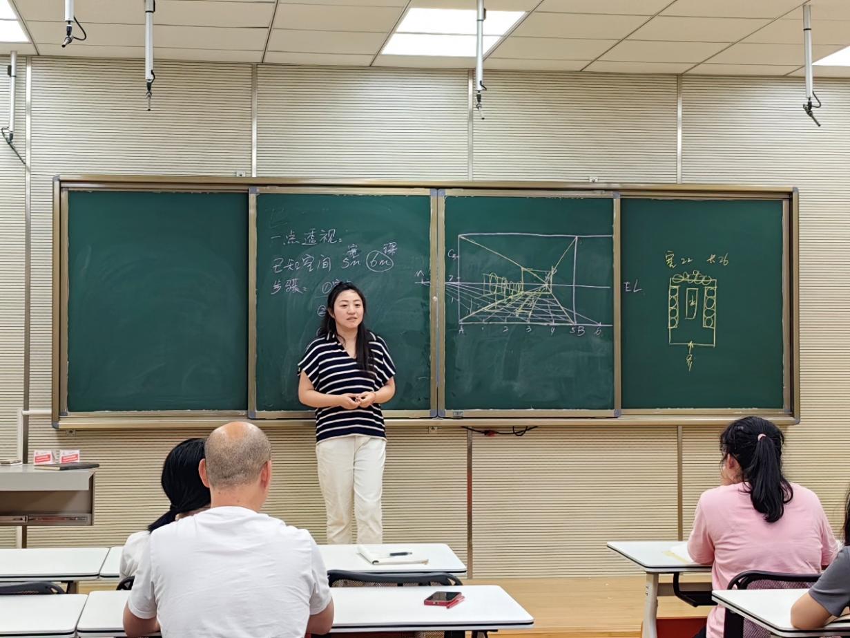 教师围绕教学内容设置、教学方法创新、教学环节优化等教学实施情况进行讲授。罗婧瑄老师讲授的内容是《环境设计效果图表现技法》(手绘)中的一点透视,课程单元设计完整,授课内容丰富,通过在黑板上手绘,进行一些原理的解析,图文并茂,通俗易懂。马优老师讲授的内容是《景观规划设计》中的空间组织原则,根据课程特点设计教学内容,运用案例分析的方法锻炼学生对空间组织的感悟能力。范芸老师讲授的内容是《立体构成》中的形式美法则,列举生活中的实例,体现了形式美法则与生活的联系。