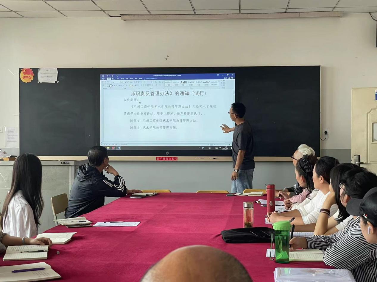 会议伊始,王坤老师向全体专任教师传达了学校对于学院的制度建设,旨在通过建章立制,将学院的各项工作规范化、合理化,有效解决了在工作中出现的各项问题。接着,王坤强调了教学工作的规范化与记录留档的重要性。他特别指出,全体教师需严格执行考勤制度,确保学生的平时作业和期末试卷的格式符合规范,并做好存档工作,以全面提升学院的教学质量与监督水平。针对本学期艺术学院新进教师数量较多,在教师管理与教师发展方面,王坤院长强调了本学期要对艺术设计教研室进行重新划分调整,以适应有教学经验的老教师对新进教师进行传帮带作用,帮助新进教师更好、更快的站稳讲台。