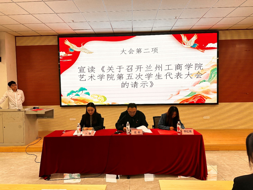 大会在庄严的国歌声中拉开帷幕,党委副书记花彤宣读了《关于召开兰州工商学院艺术学院第五次学生代表大会的请示》和《关于召开艺术学院第五次学生代表大会的批复》,团总支书记卜睿宣读了《艺术学院学生会章程(修正)》。