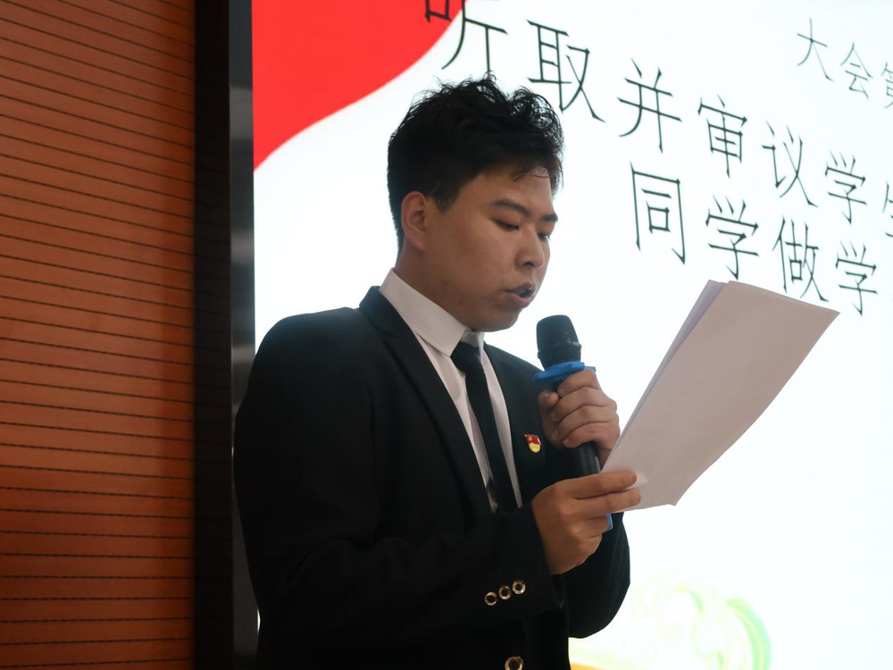 最后,学院党委副书记花彤讲话,花书记指出,学生会是在学院党委领导下,担当联系学院与学生之间的桥梁,服务于同学,代表同学意志、反映广大同学心声、维护广大同学权益的一个组织。他希望新一届的主席团同学要有担当意识、奉献精神,能够善于策划、自主开展工作,希望学生会能在创新创业这个领域发挥更大的作用,勤于实践,敢于创新,提升自身能力和担当。花书记鼓励同学们要多参加“三下乡”“返家乡”等社会实践活动,要亲自到基层去感受和了解社会的变化,多去实践实习,提升自身能力,丰富自身阅历,成就更加优秀的自己。大会在《光荣啊!共青团》的歌声中圆满落幕。