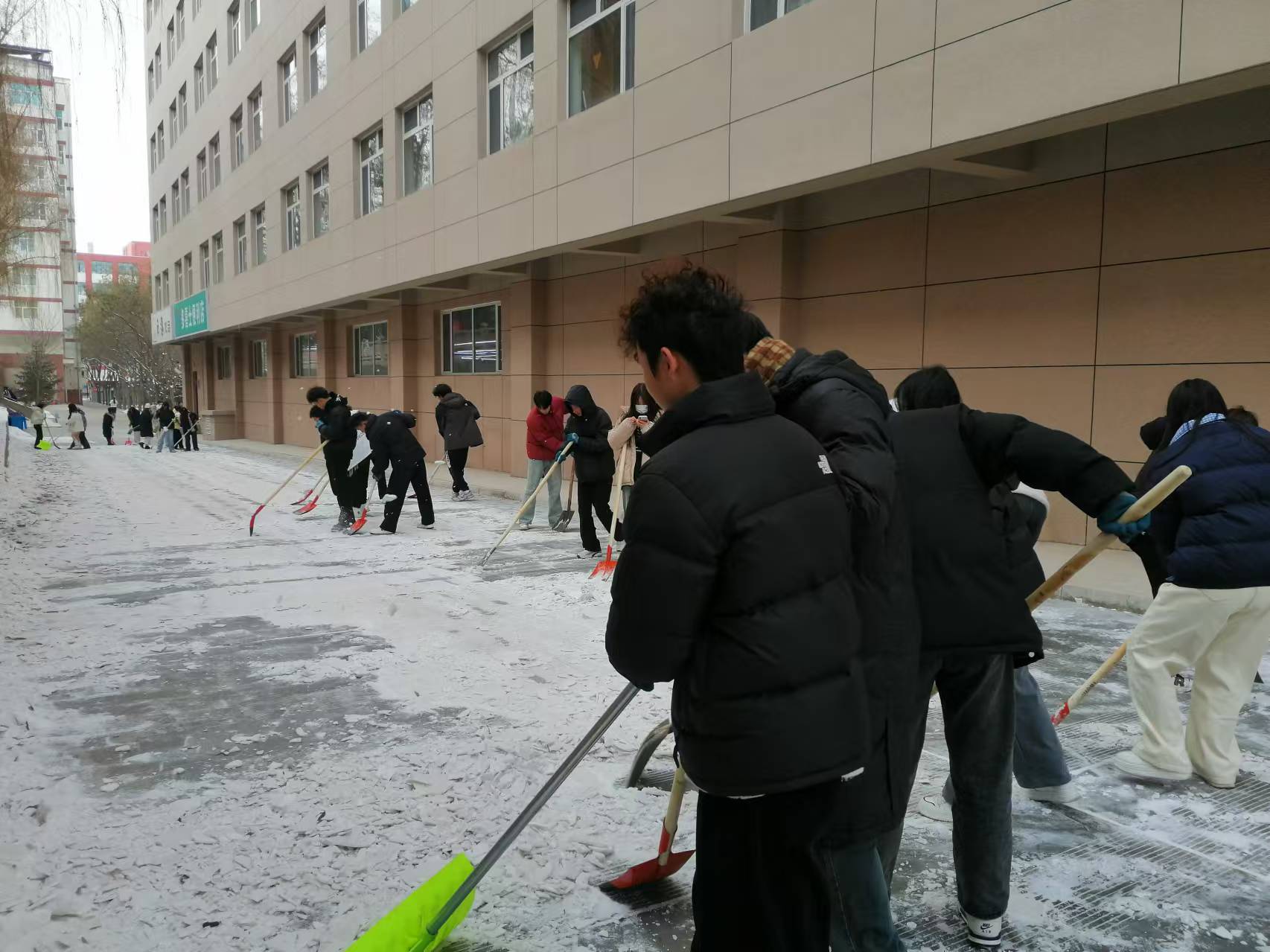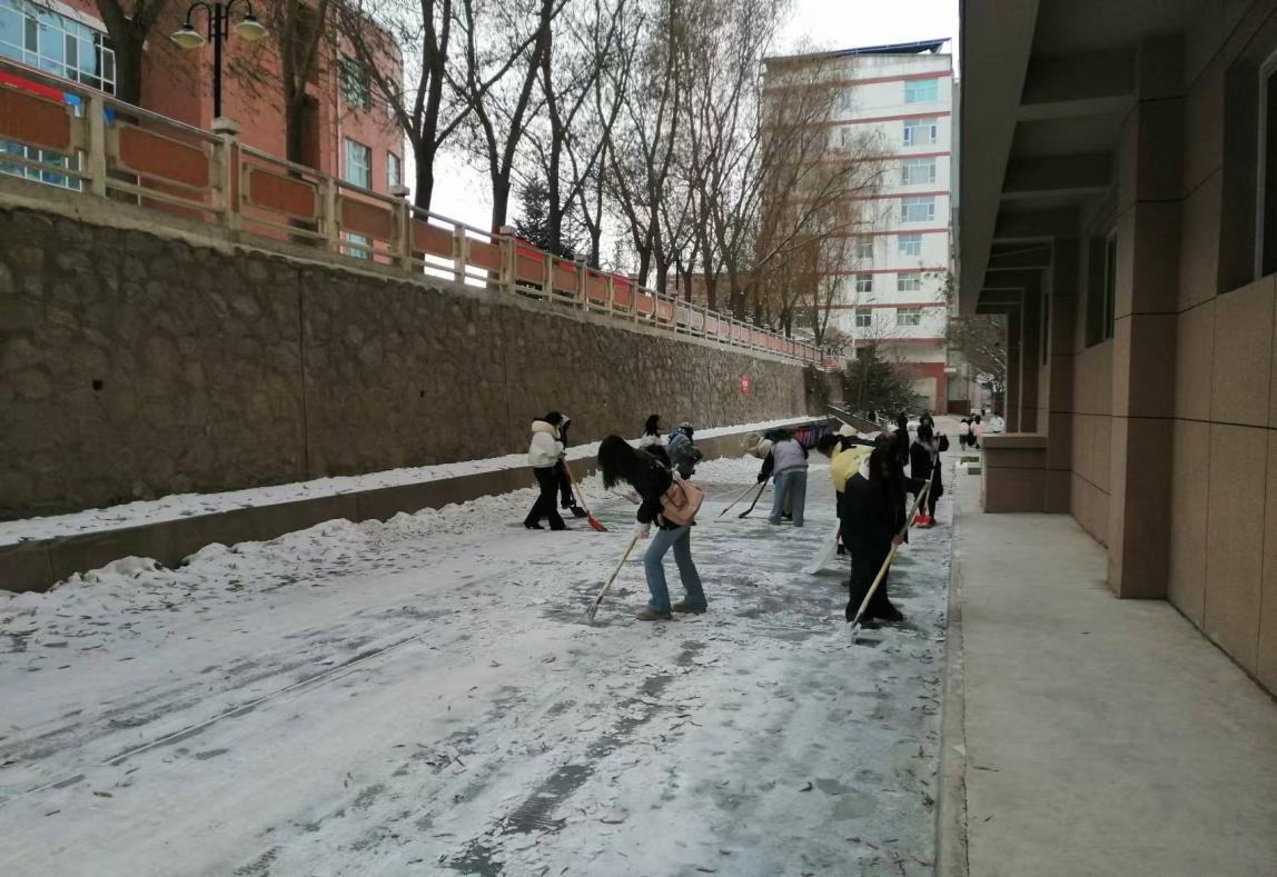 在学院领导和老师的共同参与下,同学们迅速投入到扫雪工作中。他们分工明确,有的负责铲除厚厚的积雪,有的则负责清扫路面上的碎冰和残雪。尽管天气寒冷,但同学们热情高涨,用实际行动诠释着劳动的意义和价值。