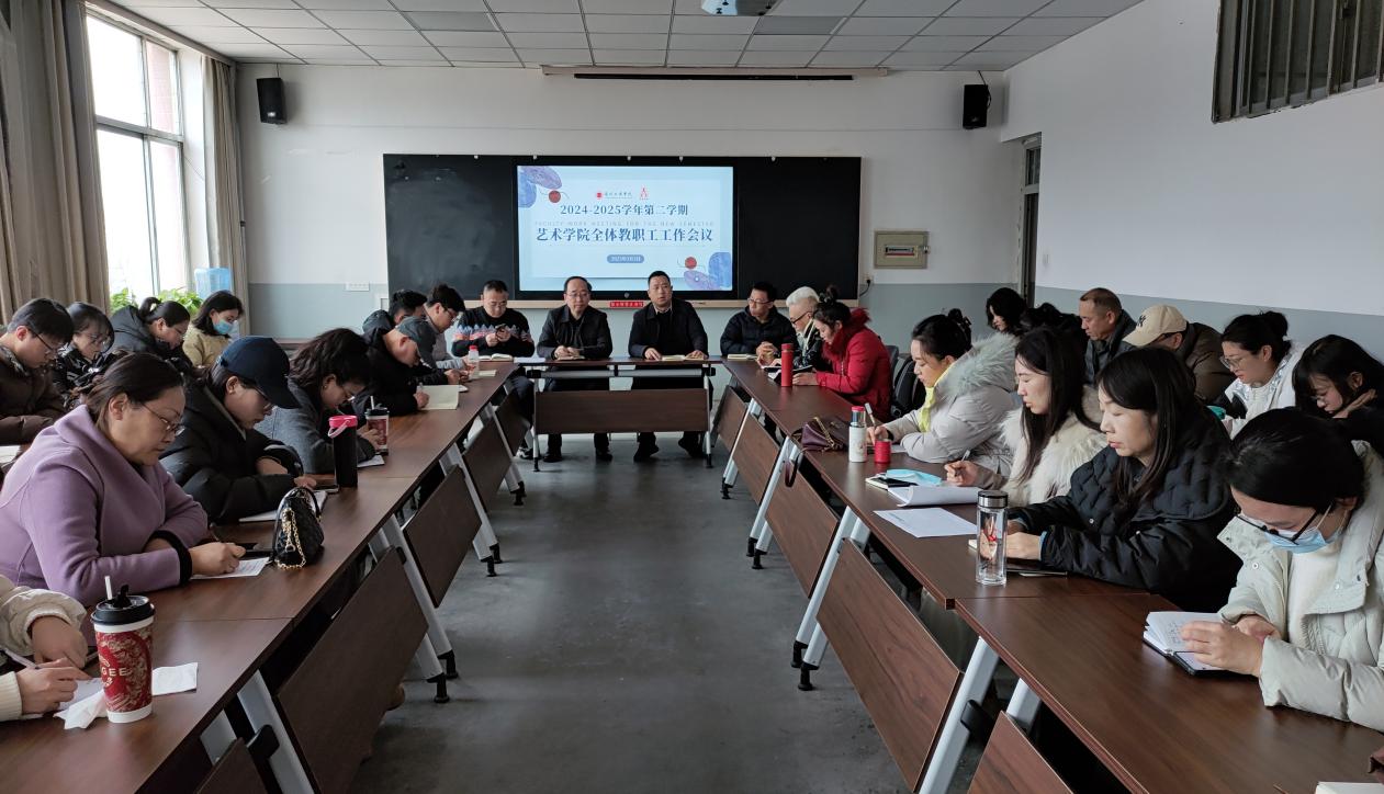 聚焦本科教学合格评估,扎实推进新学期各项工作。2025年3月2日下午,艺术学院在2-410会议室召开2024-2025学年第二学期第一次教职工工作会议。学院领导班子成员及全体教师参加了会议,会议由行政院长张德红主持。