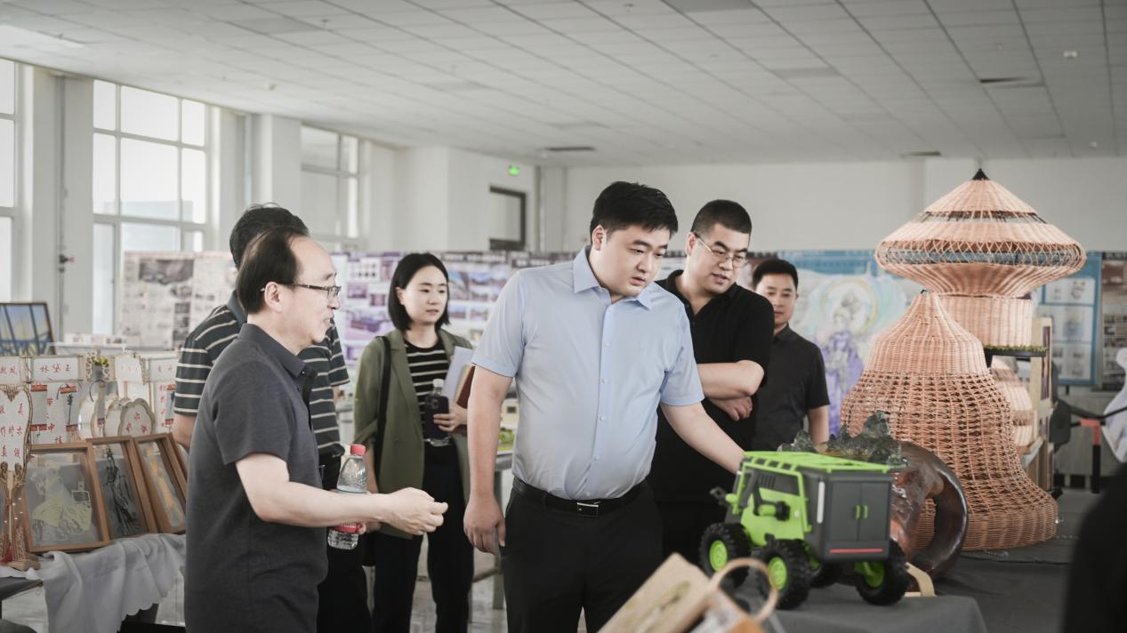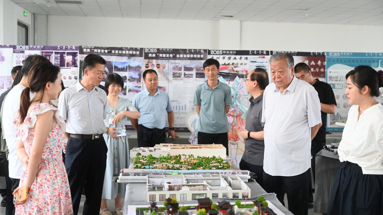 在展览现场,校领导一行细致观看了每一件作品,并与指导教师亲切交流,深入了解创作理念、技术应用及实践价值。校领导还听取了艺术学院院长杨明教授关于毕业设计教学改革、产教融合成果及学生培养成效的汇报。完颜弟董事长对艺术学院在应用型艺术人才培养方面取得的成果表示充分肯定,对毕业生们的专业能力和艺术表现力给予了高度评价,他指出:这些作品不仅体现了学生对专业知识的掌握,更展现了艺术与时代、与社会的深度融合,充分展现了艺术学院的教学成果和育人特色。