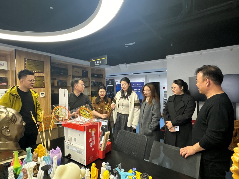在雷平新总经理的陪同下,教研室一行参观了天一智创设计部,详细了解企业在文创产品领域的研发流程与设计理念。随后,大家走进3D打印技术中心,实地观摩工业级3D打印设备、激光雕刻机及后期处理工作站的操作演示,就材料应用、工艺优化等技术细节与企业工程师展开深入交流。