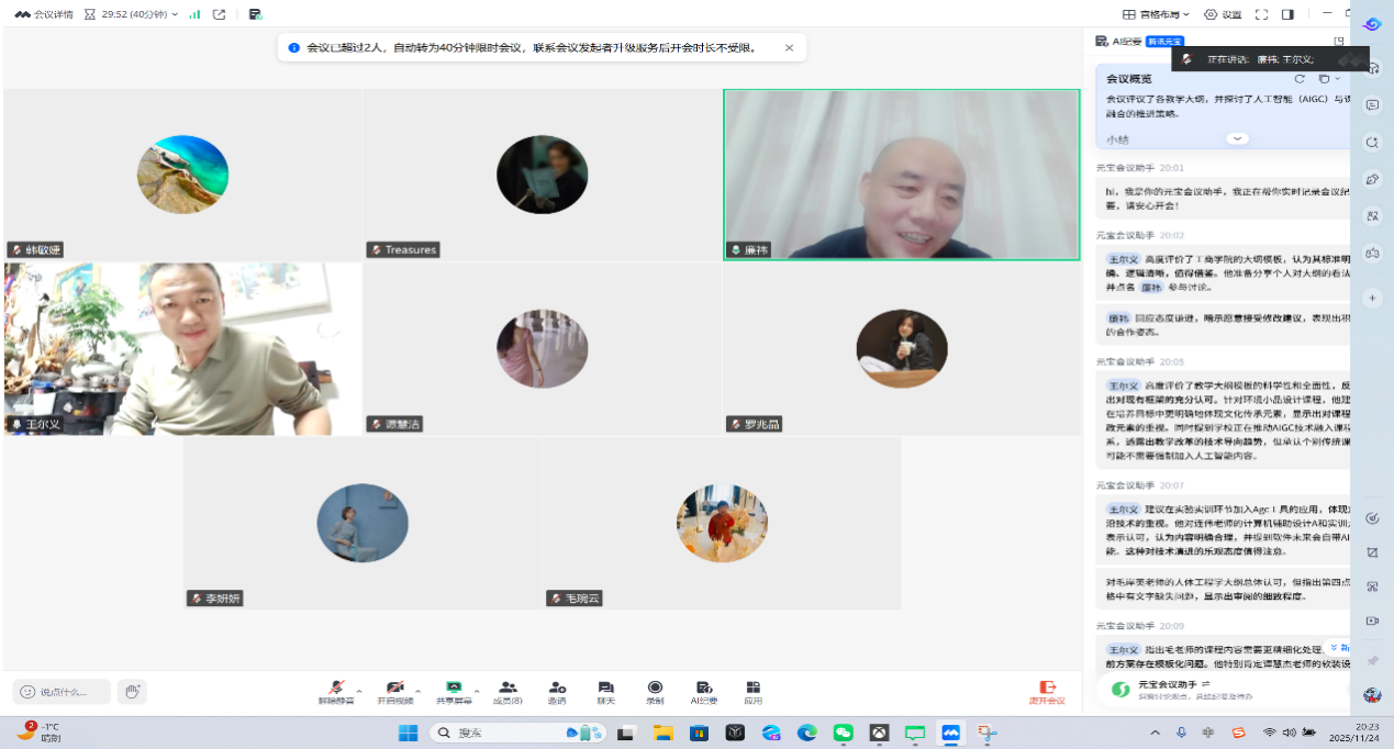 20251125环境设计第二教研室召开教学大纲线上专家评审会,旨在进一步精准对标人才培养目标,提升教学大纲科学性与实用性。特邀甘肃政法大学艺术学院胡卫国院长、华侨大学美术学院王尔义院长出席会议教研室7位教师撰写的9项教学大纲进行线上评审。教研室全体教师参加,会议由教研室主任廉祎主