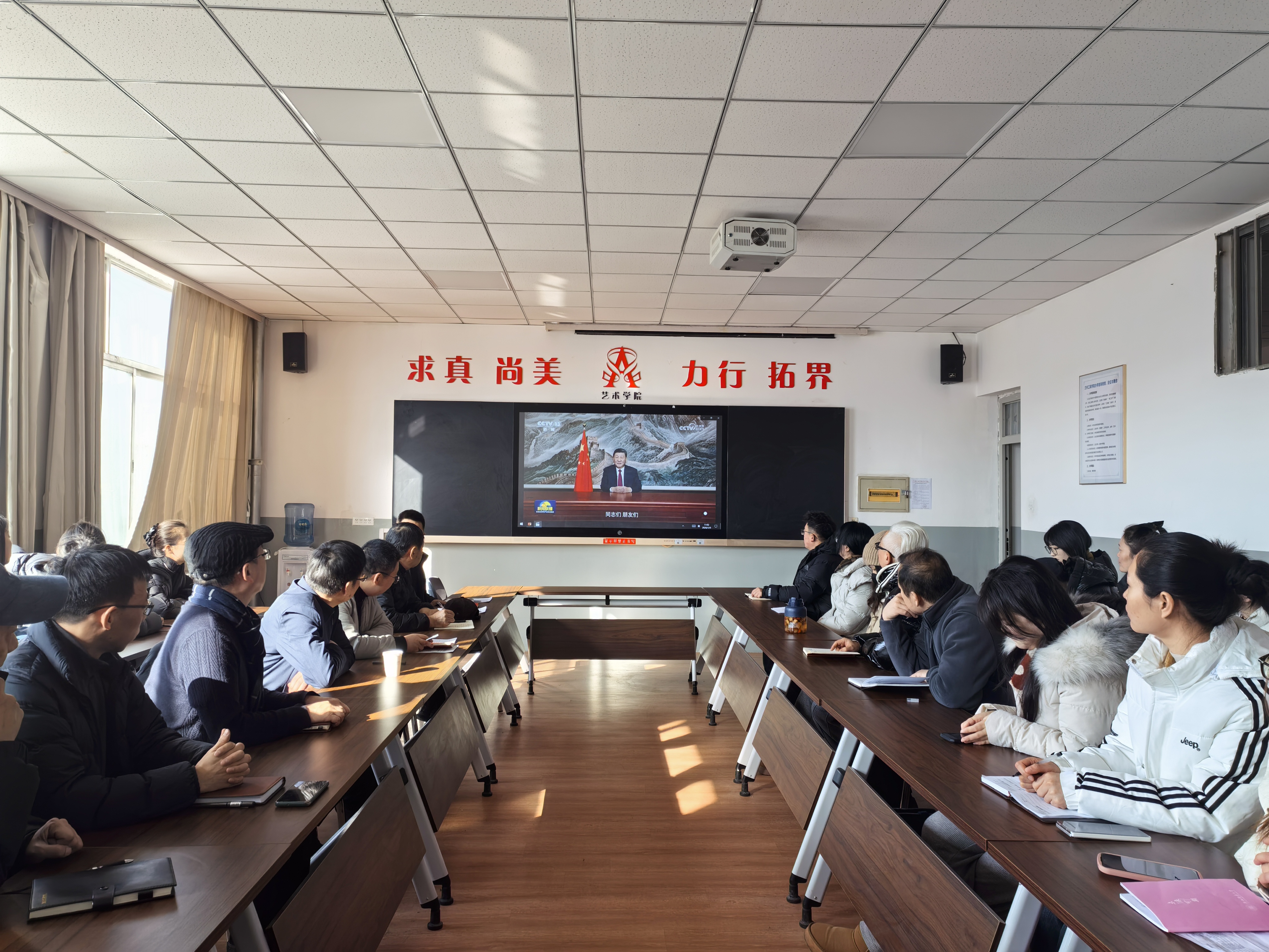 会议传达学习了习近平总书记二〇二六年新年贺词。在交流研讨环节,结合学习主题及岗位工作职责,学院党委书记毕征以“深学细悟贺词精神 以美育人勇担使命”为主题,行政院长张德红以“以贺词精神为指引扎实推进艺术学院学生工作高质量发展”为主题,进行了交流研讨发言。