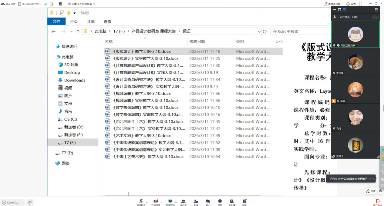 为进一步规范课程教学标准,优化人才培养体系,提升产品设计专业教学质量,2026年3月11日,艺术学院产品设计教研室通过腾讯会议线上形式召开教学大纲论证会。会议特邀陕西科技大学贺雪梅教授、兰州理工大学邱凯教授担任论证专家,为专业教学大纲修订把脉定向。教研室全体教师参会,会议由教研室主任范芸主持。