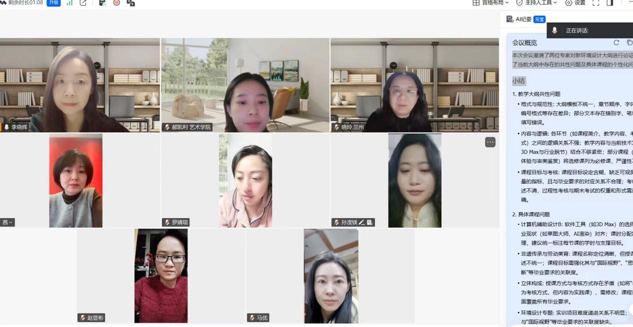 为进一步深化教育教学改革,优化人才培养体系,提升环境设计专业课程建设质量,2026314日,艺术学院环境设计第一教研室通过线上平台召开教学大纲论证会。特邀教育部高等学校设计学类专业教学指导委员会委员、甘肃省高等学校设计学类专业教学指导认证与教材建设委员会副主任委员、兰州文理学院美术与设计学院院长吴晓玲教授,西北民族大学美术学院副院长王茜担任评审专家,为本次教学大纲论证提供了专业、权威的指导。教研室全体教师参会,会议由教研室主任李晓辉主持。
