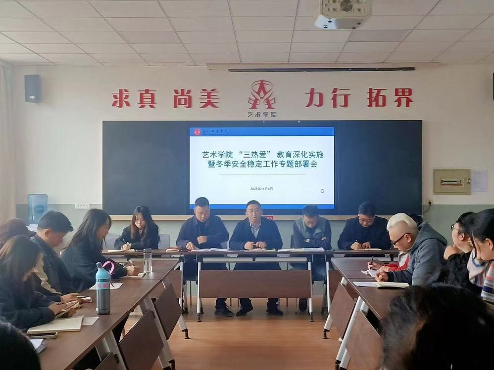 为深入落实学校“三热爱”教育,筑牢冬季校园安全防线,2025年11月6日,艺术学院在2-410会议室召开“三热爱”教育深化实施暨冬季安全稳定工作专题部署会。学院领导班子成员、全体教师、辅导员参加会议,会议由学院党委书记毕征主持。