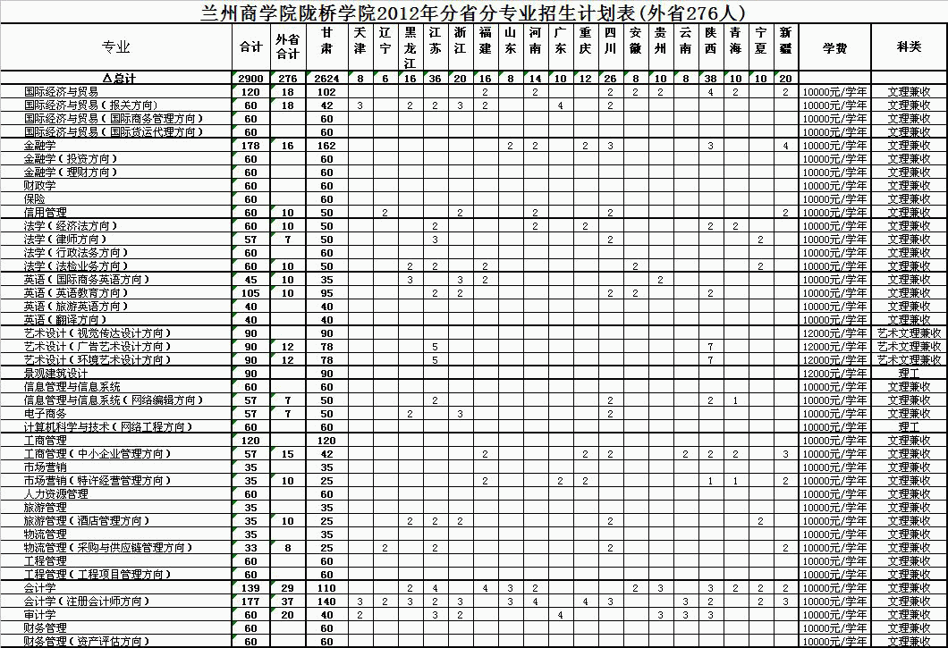 兰州商学院陇桥学院2012年招生计划表