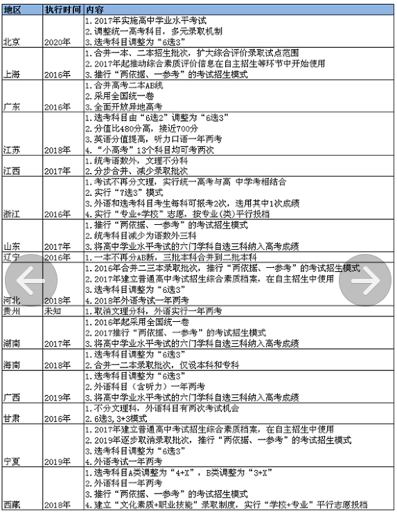 据记者初步统计,全国已有16省份先后出台了本地区高考改革方案,分别为北京、上海、广东、江苏、江西、浙江、山东、辽宁、河北、贵州、湖南、海南、广西、甘肃、宁夏、西藏。此外,安徽、福建、四川将于今年公布本省高考改革方案。通过梳理不难发现,改革招生批次和科目设置是多省份改革的重点。
