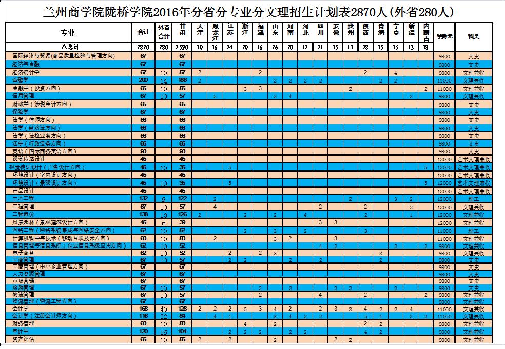 兰州财经大学陇桥学院2016年招生计划